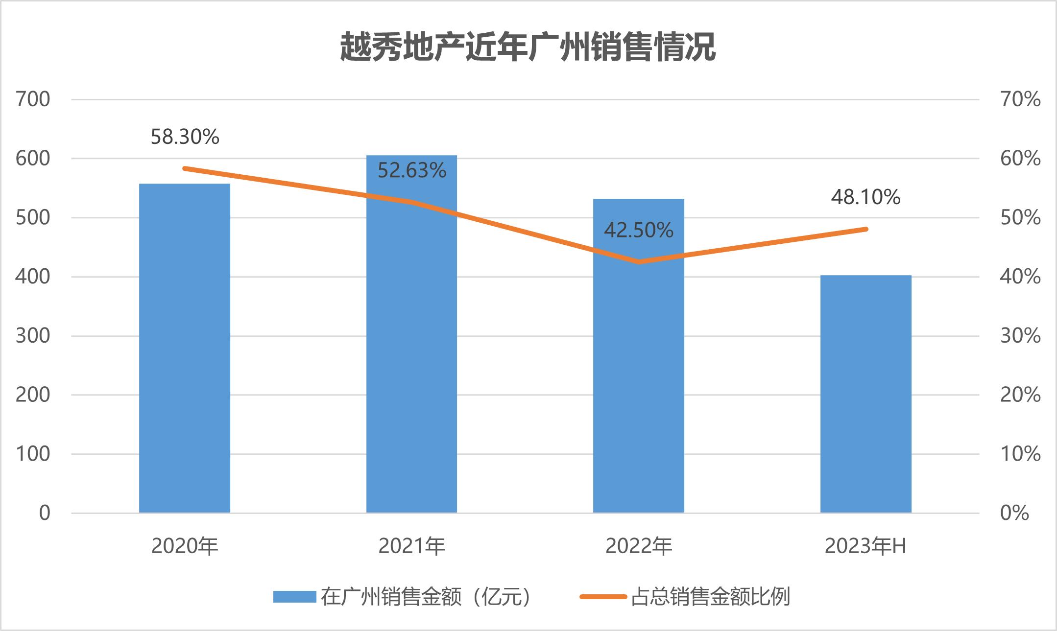 從銷售資料上看,越秀地產2021年在廣州區(qū)域實現(xiàn)的合同銷售額606億元,同比增長8.6%,占全部銷售額約52.63%;2022年資料為銷售金額531.9億元,占比42.5%;2023年上半年,越秀地產在廣州實現(xiàn)銷售402.6億元,占比達48.1%。