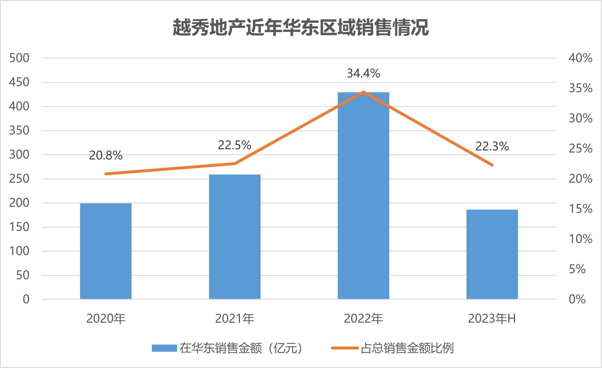 華東區(qū)域方面,越秀地產共進入6個城市,截至2023年6月30日,總土儲中華東地區(qū)占比18.8%。