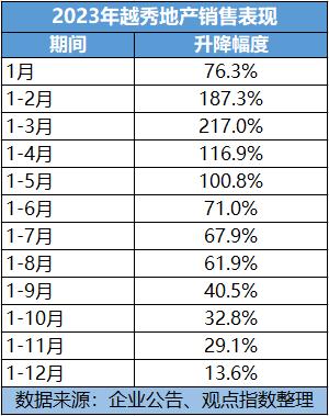 全年的高增長也受到影響,2023年前3個月越秀地產錄得銷售增幅217%,半年度時候為71%,到9月末增幅降至40.5%,最新增幅下滑到13.6%。