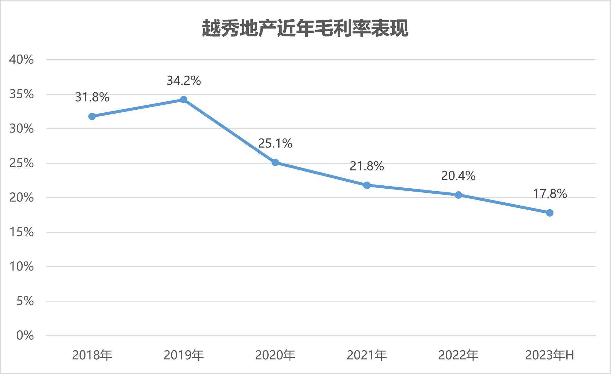 反映到利潤端,據(jù)2023年半年報,越秀地產毛利潤為57億元,同比降低14.2%。毛利率為17.8%,首次下降至20%以下。
