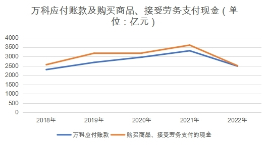 值得注意的是,2018年到2022年,萬科購買商品、接受勞務支付的現(xiàn)金分別為2559億元、3173億元、3184億元、3606億元和2502億元。