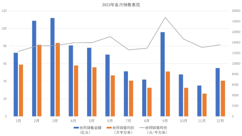 截至2023年12月底,融創(chuàng)累計實現(xiàn)合同銷售金額約847.7億元,累計合同銷售面積約607.6萬平方米,合同銷售均價約人民幣13950元/平方米。其中,12月單月實現(xiàn)合同銷售金額約54.9億元,合同銷售面積約40.5萬平方米,合同銷售均價約13550元/平方米。