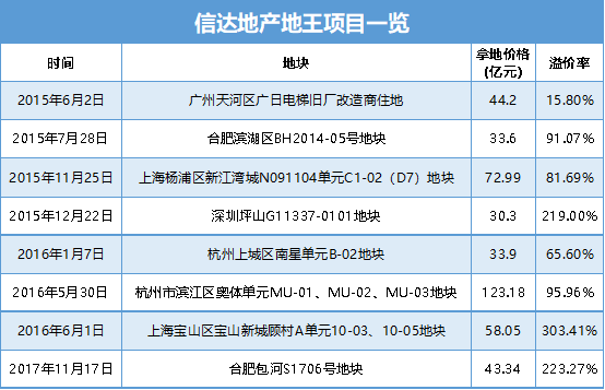 有數(shù)據(jù)顯示,在2015年至2017年短短三年時(shí)間里,信達(dá)斥資440億八奪地王,成為行業(yè)“地王制造機(jī)”。