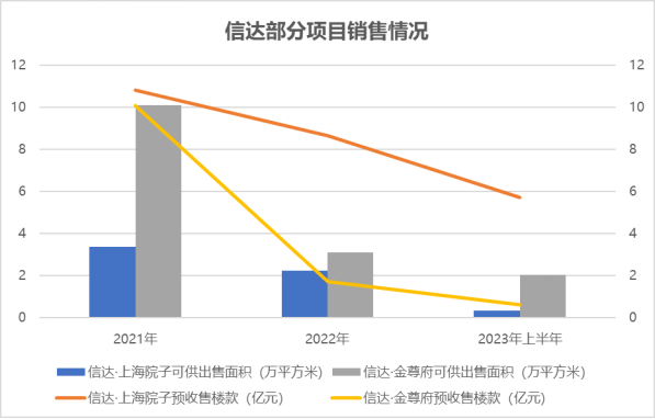 2022年財(cái)報(bào)披露,信達(dá)·上海院子預(yù)售比例達(dá)到了97%,同年可供銷售的面積為2.23萬平方米,已預(yù)售面積為1.9萬平方米,預(yù)收售樓款及結(jié)轉(zhuǎn)收入分別為8.64億元、27.7億元。