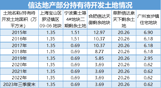 財(cái)報(bào)數(shù)據(jù)透露,上海寶山區(qū)羅涇鎮(zhèn)區(qū)09-06地塊、阜新信達(dá)泉天下剩余土地從2015年至今始終未見減少;合肥信達(dá)天御剩余地塊于2015年持有待開發(fā)面積為12.97萬平方米,直至2023年三季度末仍剩余3.69萬平方米。
