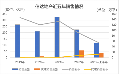 據(jù)了解,2021年,信達(dá)地產(chǎn)錄得銷售金額325.18億元,為上市以來的最高值;2022年受樓市下行影響,該公司銷售金額有所下滑,至224.18億元。不過,代建銷售金額提升至57.8億元。