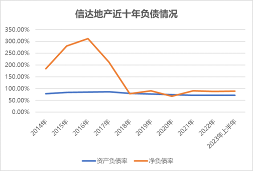 地王項(xiàng)目難以去化,意味著這類高成本項(xiàng)目對(duì)上市公司帶來的盈利空間較小,從而導(dǎo)致公司整體盈利質(zhì)量較低。加之大手筆拿地疊加后續(xù)開發(fā)建設(shè)的資金支出,信達(dá)地產(chǎn)負(fù)債水平不斷被推高。