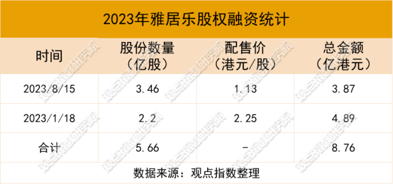 2023年,雅居樂集團(tuán)兩次進(jìn)行股權(quán)融資,總配售金額8.76億港元,但由于股市行情低迷、股價(jià)受挫,股權(quán)融資已經(jīng)很難繼續(xù)滿足雅居樂的資金需求。
