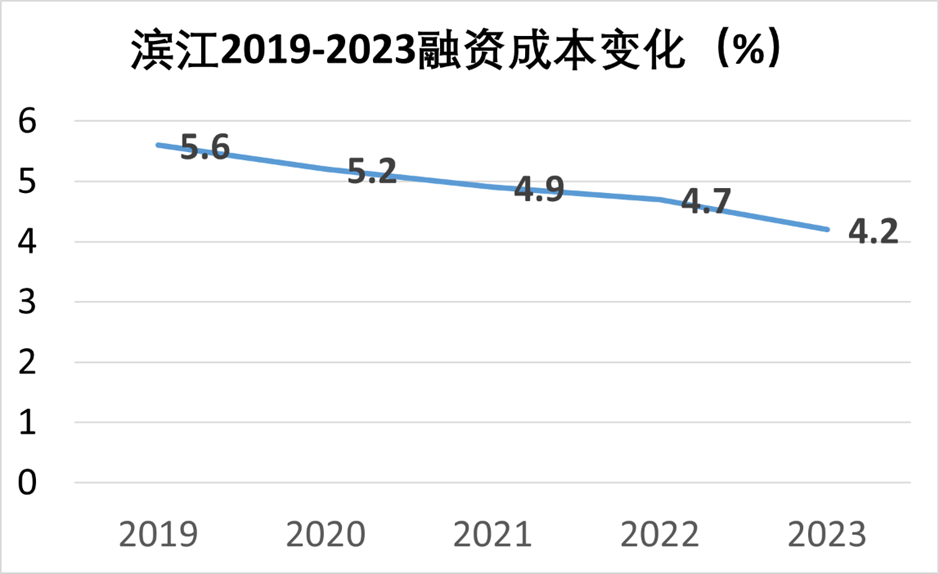 正如戚金興于懇談會上所透露的信息,濱江近年來融資成本呈現(xiàn)下降趨勢,從2017年的6%逐漸下降到2018年5.8%、2019年5.6%、2020年5.2%、2021年4.9%、2022年4.6%,而2023年三季度末4.4%,年末降低至4.2%。