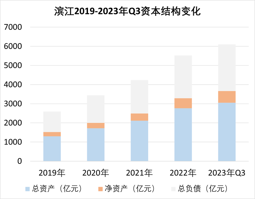 先從負(fù)債端觀察,截至12月25日,濱江權(quán)益有息負(fù)債余額357億元,相比2022年下降113億元;截止三季度末,濱江有息負(fù)債為425.57億元,其中銀行貸款占比76%,直接融資占比24%;扣除預(yù)收款后的資產(chǎn)負(fù)債率為55.71%,凈負(fù)債率為21.54%。