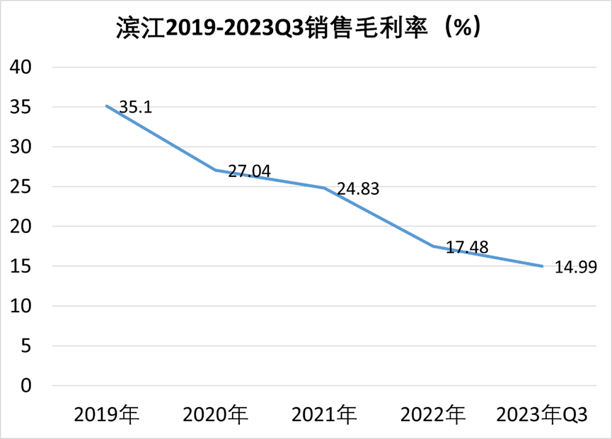 具體來看,由于營業(yè)成本與營業(yè)收入同步增長,濱江2023年上半年房地產(chǎn)業(yè)務(wù)毛利率下降至18.29%,間接導(dǎo)致2023年前三季度歸母凈利率較2022全年下降3.7個百分點(diǎn)。