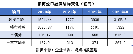 融資結構角度,銀行貸款依然是房企最倚仗的融資渠道,只不過在近幾年招商蛇口加杠桿進程中,這一渠道的占比有所降低,2022年降至不足59%;與之相反,債券融資所占比重逐漸提高,2022年占比達到27.48%。