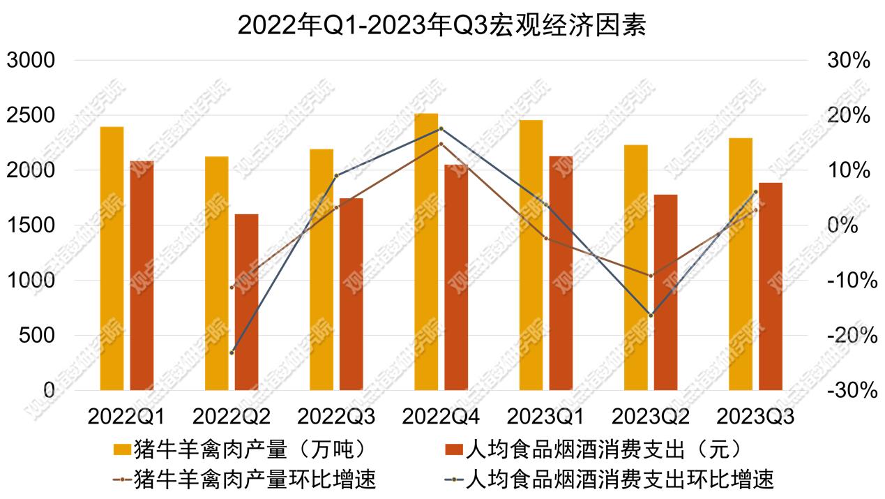 從2023年開(kāi)始,豬牛羊禽肉產(chǎn)量、人均食品煙酒消費(fèi)支出逐季下降,雖然第三季度略有回升,但平均增速(兩者平均增速均為負(fù))保持下降趨勢(shì),供應(yīng)和需求兩端的減少也意味著對(duì)冷鏈物流的需求減少。