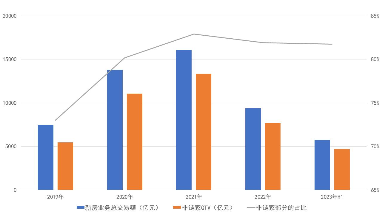 從數(shù)據(jù)來(lái)看,新房業(yè)務(wù)總交易額以非鏈家產(chǎn)生的為主。2019-2022年,非鏈家GTV分別為5458、11063、13346、7705億元,占新房業(yè)務(wù)GTV比例分別為73%、80%、83%、81.92%。