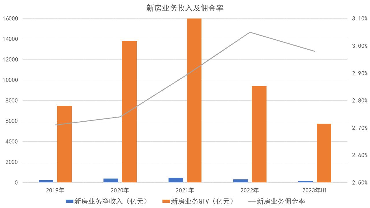 但要注意的是,傭金率(凈收入/gtv)提升明顯。2019-2022年,新房業(yè)務(wù)交易傭金率分別為2.72%、2.75%、2.89%、3.05%。