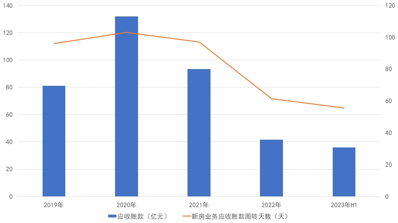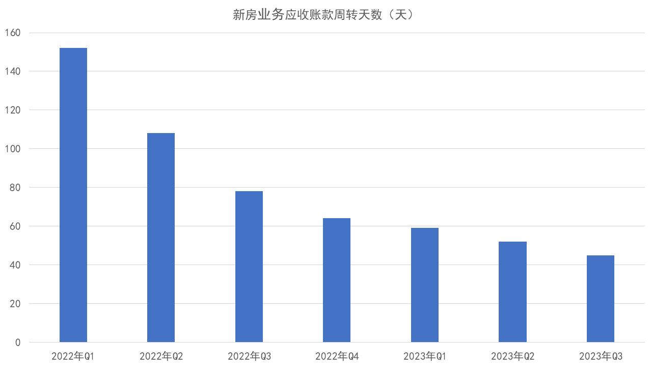 2023年二季度,貝殼新房回款增加至100.6億元,連續(xù)8個(gè)季度超過(guò)新房收入,并在第三季度繼續(xù)超過(guò)。同期,開(kāi)發(fā)商預(yù)付傭占總傭金的比例同比提升至53%,新房應(yīng)收賬款周轉(zhuǎn)天數(shù)縮短至僅52天,創(chuàng)下上市以來(lái)的新低。