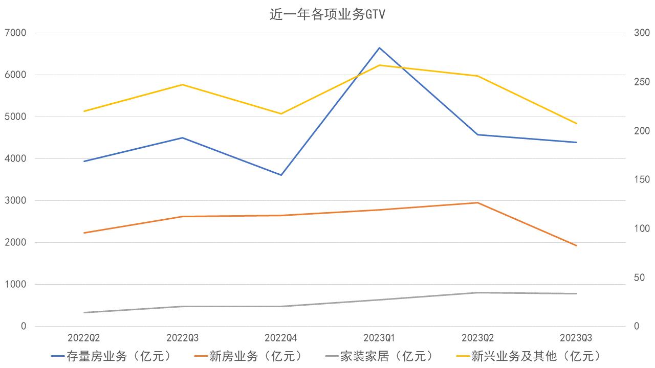 從貝殼的數(shù)據(jù)來(lái)看,2023年以來(lái),存量房業(yè)務(wù)、新房業(yè)務(wù)交易額難掩下降趨勢(shì)。但同時(shí),家裝家居與新興業(yè)務(wù)同比取得增長(zhǎng)。