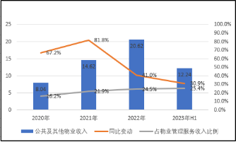 相關(guān)收入也從2020年的8.04億升至2022年的20.62億元,三年復(fù)合增長率達36.88%,占公司物管業(yè)務(wù)收入的比例從16.2%升至24.5%。
