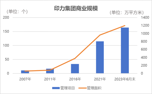 翻閱印力官網(wǎng)發(fā)現(xiàn),截至2023年10月,旗下運(yùn)營管理項(xiàng)目超164個,遍布全國53個城市,資產(chǎn)規(guī)模近1000億元,管理面積近1200萬平方米。