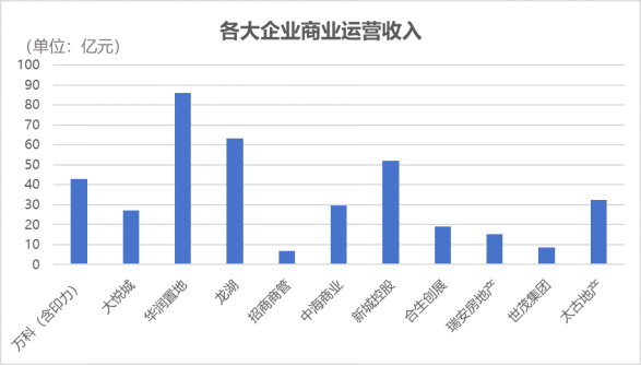 項(xiàng)目數(shù)量、管理規(guī)模均不及萬科的華潤置地,同期實(shí)現(xiàn)商業(yè)業(yè)務(wù)收入86億元;龍湖集團(tuán)同樣實(shí)現(xiàn)了63.3億元的相關(guān)業(yè)務(wù)收入,接近萬科的1.5倍。