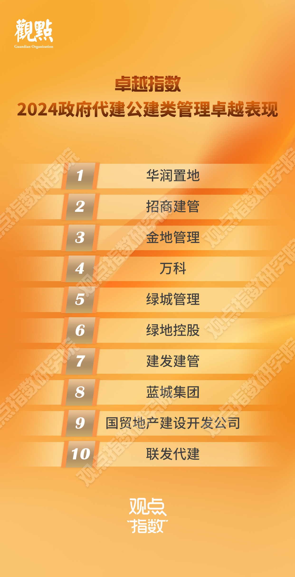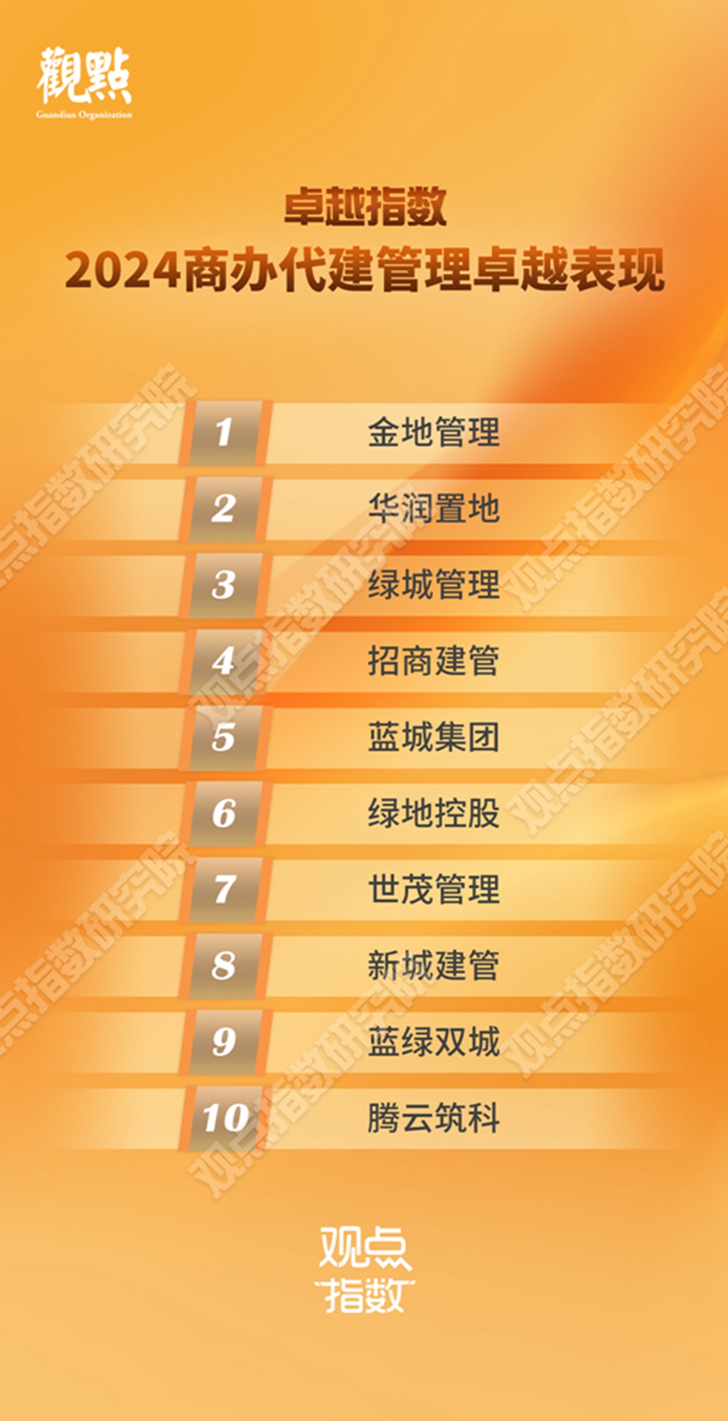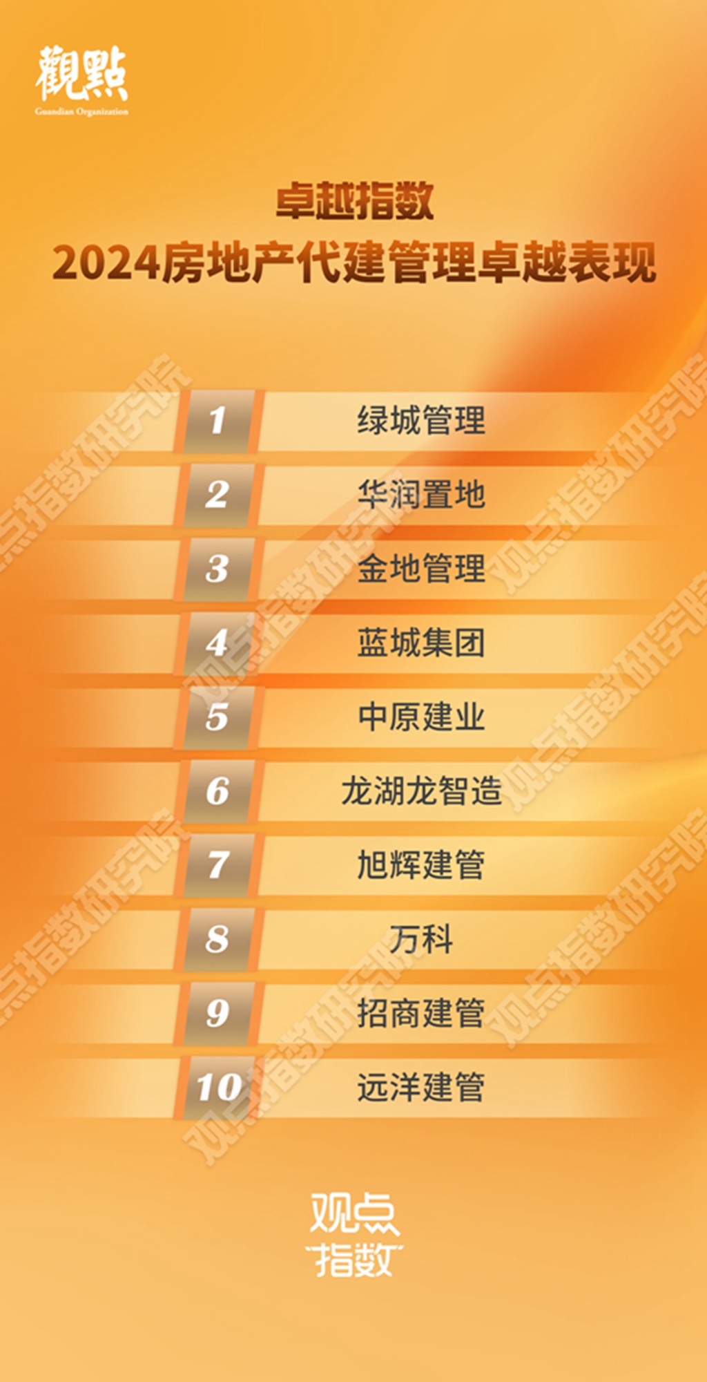 最終研究顯示,綠城管理、華潤置地、金地管理公司、藍(lán)城集團和中原建業(yè)分別位居“2024房地產(chǎn)代建管理卓越表現(xiàn)”前列。