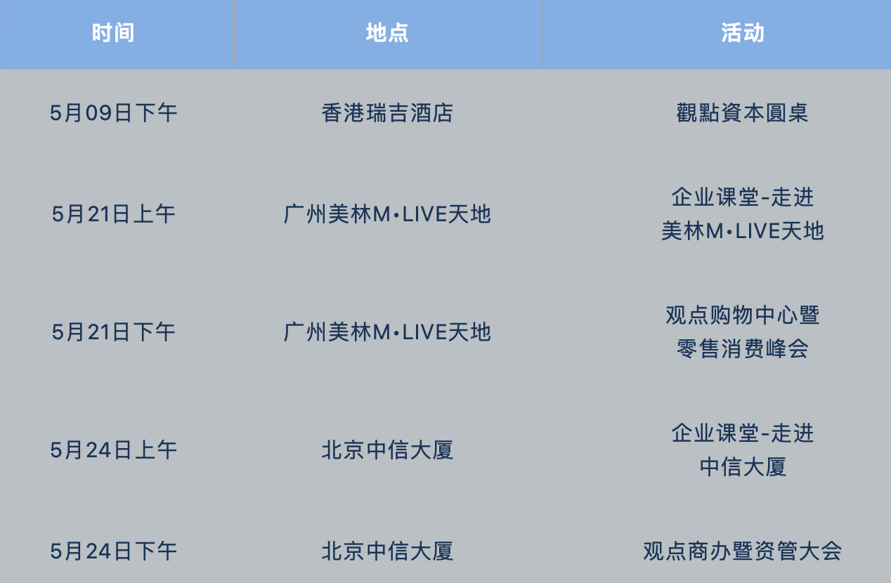 從香港到廣州再到北京,觀點5月商業(yè) ? 資本金融活動季全面開啟,從消費零售到商業(yè)辦公,從REITEs到大宗資產(chǎn)交易,財富管理與傳承到新投資機會,三座城,南北呼應,激發(fā)出我們最敏銳的商業(yè)嗅覺。