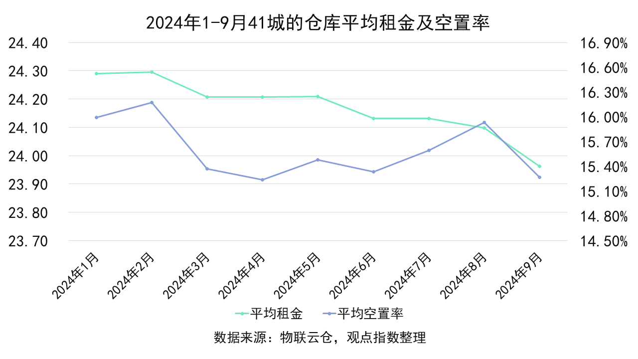 具體來看, 9月41個城市的平均租金為23.96元/平方米/月,環(huán)比下降0.57%,同比下降5.48%,而空置率為15.26%,環(huán)比下降0.74個百分點,同比上升3.12個百分點。