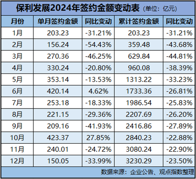從全年數(shù)據(jù)來看,保利發(fā)展只有6月與10月錄得單月簽約金額同比上升,其余月份均有不同程度的下探。