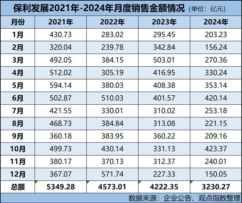據(jù)觀點新媒體統(tǒng)計,保利發(fā)展2021年-2024全口徑銷售總金額分別為5349.28億元、4573.01億元、4222.35億元、3230.27億元。目前,行業(yè)TOP5格局是保利發(fā)展、中海、萬科和綠城中國、華潤置地。