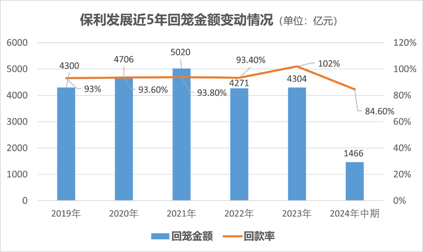 據(jù)保利發(fā)展2024年中期報告,受二季度銷售占比高、當(dāng)期回籠周期短的影響,公司期內(nèi)累計實現(xiàn)回籠金額1466億元,回籠率84.6%。該項數(shù)據(jù)在2023年同期約為2273億元、96%。