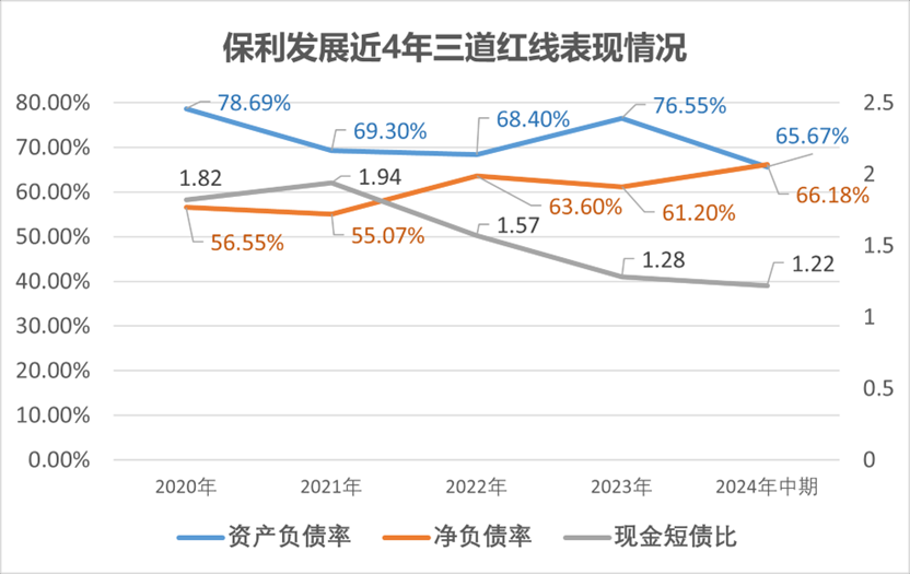 值得指出,保利發(fā)展近年來資產(chǎn)負債結(jié)構(gòu)一直處于優(yōu)化當(dāng)中,也一直保持在三道紅線的綠檔水平。