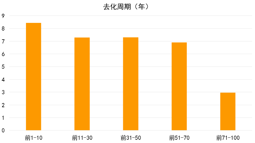 根據(jù)計(jì)算結(jié)果,前100房企土地儲(chǔ)備為22.15億平方米,平均去化周期為5.85年,比去年縮短約2年。其中,前10房企去化周期6.66年;前71-100房企的土地儲(chǔ)備收縮較明顯,未來(lái)去化周期在3年以?xún)?nèi)。