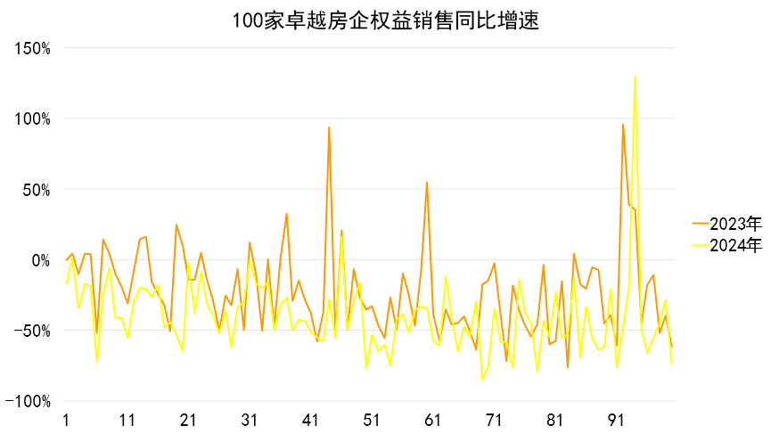 具體來(lái)看,2024年卓越100大部分企業(yè)的權(quán)益銷(xiāo)售金額較去年有所減少,極少數(shù)企業(yè)權(quán)益銷(xiāo)售實(shí)現(xiàn)同比增長(zhǎng),最高增長(zhǎng)率為129.38%,最大降幅為84.83%,同比增速中位數(shù)為-42%。(2023年最高增長(zhǎng)率為95.8%,最大降幅為76.2%,同比增速中位數(shù)為-25.4%)