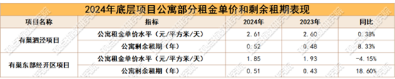整體來看,截至2024年末,按房間數(shù)量計算,底層項目公寓整體出租率同比提升1.35個百分點至94.33%;公寓租金單價為2.19元/平方米/天,同比下滑1.79%;整體剩余租期為0.52年,同比上漲15.56%。