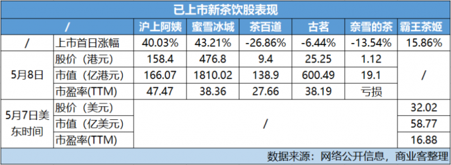 同時,蜜雪冰城也帶動了后來者的熱度。自上市以來截至5月8日收市,古茗上漲幅度更達到171.5%。