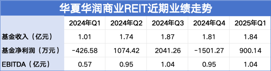 從最新披露的數(shù)據(jù)來看,2025年一季度,華夏華潤(rùn)商業(yè)REIT的基金收入為1.84億元,完成度為101.04%,凈利潤(rùn)也扭虧為盈,達(dá)到900.14萬元,基金EBITDA為1.04億元,預(yù)測(cè)完成度為109.06%。