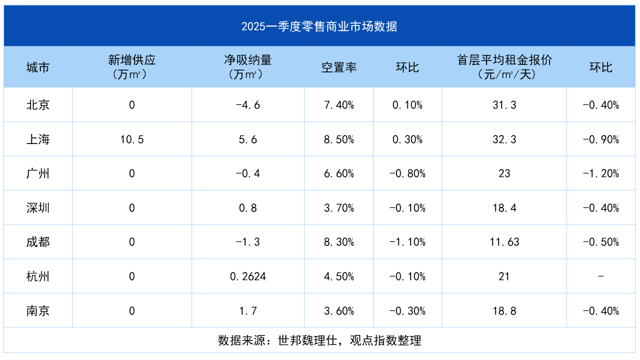 在消費動能不足的背景下,零售商業(yè)市場承受不小的壓力。核心商業(yè)城市方面,最新的2025年一季度,除上海有新增供應(yīng)外,其余城市均無新項目開出。