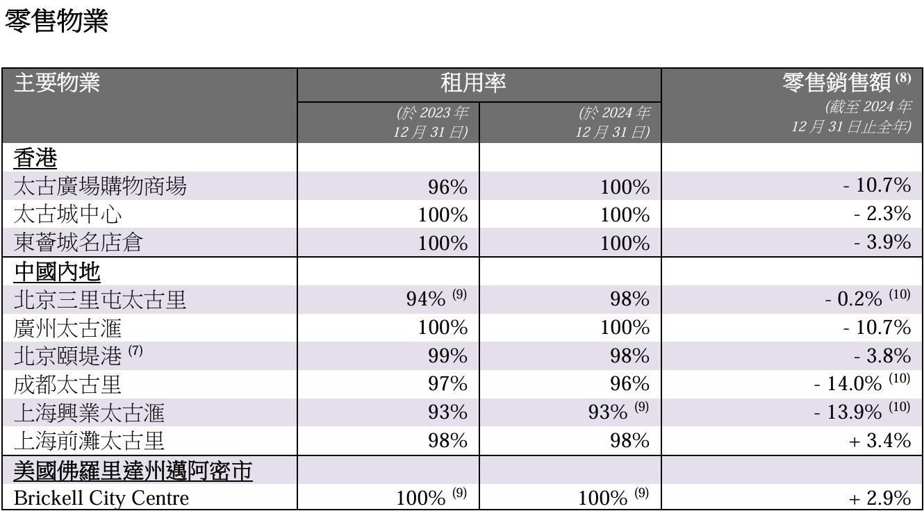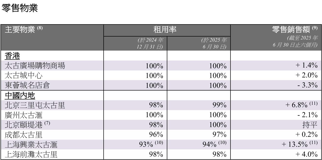 這批物業(yè)于2025年上半年出租率全數(shù)獲得提升,且除了比較依賴重奢銷售的廣州太古匯銷售額錄得2.1%跌幅外,其余商場全部重回增長。