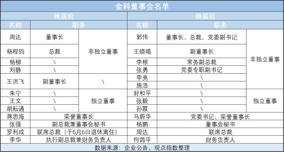 當(dāng)天晚上,該公司一次性發(fā)布了8條公告,大部分都跟董事會(huì)有關(guān),當(dāng)中正式披露了新一屆領(lǐng)導(dǎo)班子名單,包括郭偉獲任金科股份董事長(zhǎng)、總裁、黨委副書(shū)記,王曉晴任副董事長(zhǎng),周達(dá)為聯(lián)席總裁,李根為常務(wù)副總裁,張勇為黨委專職副書(shū)記,楊鵬為董事會(huì)秘書(shū),何鴿平為財(cái)務(wù)負(fù)責(zé)人。