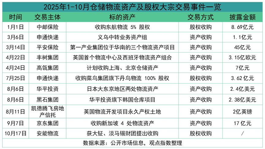 2025年1-10月,倉儲物流資產及股權領域的大宗交易頻繁落地,成為推動行業(yè)結構優(yōu)化的重要力量,形成“國內資產整合”與“全球資本布局”兩大發(fā)展主線,行業(yè)資源配置效率與全球化水平同步提升。