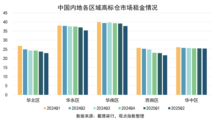 2025年二季度整體高標(biāo)倉空置率環(huán)比上季度上升0.5個(gè)百分點(diǎn)至17.8%,根據(jù)戴德梁行數(shù)據(jù),平均租金比2024年一季度微降3.6%至29.7元/㎡·月。