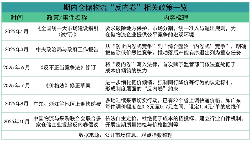 8月起,廣東、浙江等22個(gè)省份陸續(xù)調(diào)整快遞價(jià)格,調(diào)價(jià)幅度在0.3元至0.7元之間,如廣東設(shè)定1.4元/單的底線價(jià),通過價(jià)格機(jī)制改革遏制低價(jià)傾銷行為;10月,中國物流與采購聯(lián)合會(huì)聯(lián)合多家倉儲(chǔ)企業(yè)發(fā)起反內(nèi)卷倡議,提出依法自主定價(jià)、杜絕低于成本的招投標(biāo)、建立行業(yè)自律機(jī)制、開展定期質(zhì)量抽檢與價(jià)格監(jiān)測等措施,多家快遞企業(yè)調(diào)整經(jīng)營戰(zhàn)略,將競爭重心從規(guī)模擴(kuò)張轉(zhuǎn)向服務(wù)品質(zhì)提升。