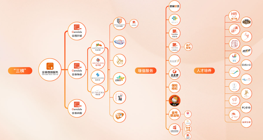 金地智慧服務(wù)專注住宅業(yè)務(wù)、商服業(yè)務(wù)及城市服務(wù)三大基礎(chǔ)業(yè)務(wù)板塊,同時也在空間科技、體育產(chǎn)業(yè)及其他創(chuàng)新型業(yè)務(wù)領(lǐng)域協(xié)同發(fā)力,目前主要擁有金地物業(yè)、金地商服、金智仟城、增值服務(wù)、金地空間科技等業(yè)務(wù)平臺。
