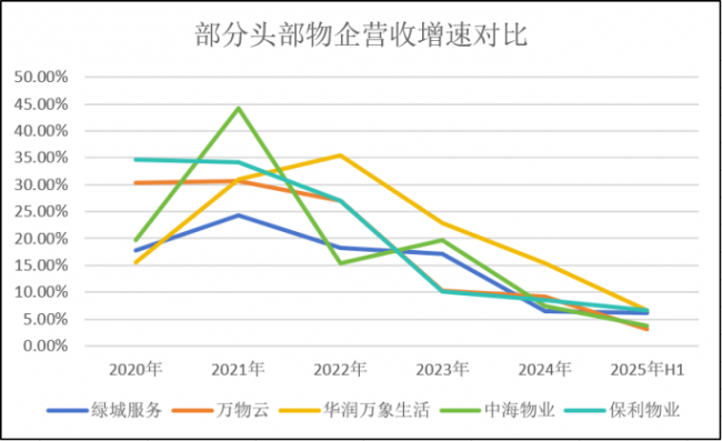 從數(shù)據(jù)來看,綠城服務(wù)營收增速從2021年開始就在逐年下降,并在2024年跌至個位數(shù)。具體來看,2020-2024年以及2025上半年增速分別17.8%、24.3%、18.2%、17.1%、6.5%、6.1%。