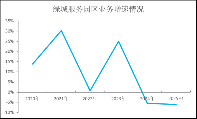 投資失敗的結(jié)果是園區(qū)服務(wù)增速出現(xiàn)明顯下滑,特別是在2024年,綠城服務(wù)不再將MAG納入并表范圍后,該業(yè)務(wù)出現(xiàn)了首次負(fù)增長,2025上半年延續(xù)了這一趨勢,且跌幅略微擴(kuò)大至6.0%。