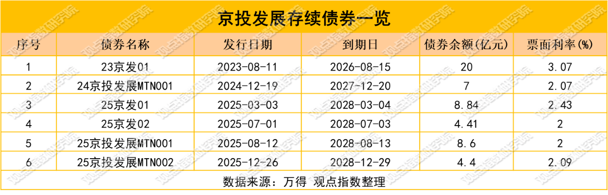近一年來,面對持續(xù)緊繃的資金壓力,京投發(fā)展的融資動作始終保持高頻態(tài)勢,融資渠道不斷拓寬,涵蓋債券、永續(xù)債、股東借款等多種形式。據(jù)Wind數(shù)據(jù)顯示,截至目前,京投發(fā)展合計存續(xù)6筆債券,總金額為53.25億元,其中4筆均在2025年發(fā)行。