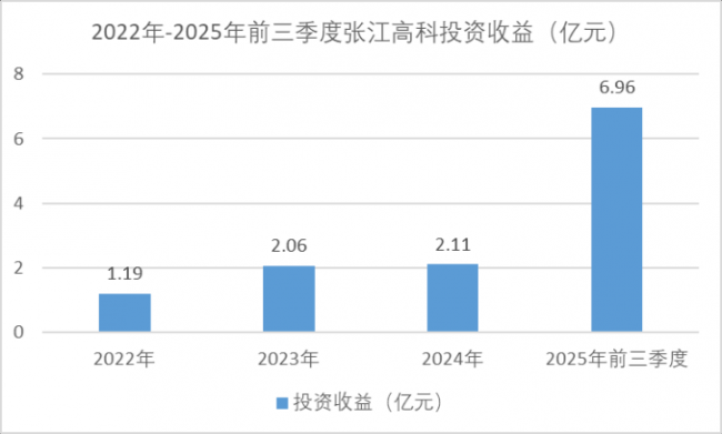 2022年,張江高科投資收益僅有1.19億元;至2025年前三季度,該部分收益(含公允價值變動凈收益)增至6.96 億元,較上年同期0.71億元同比大幅增加885.61%。