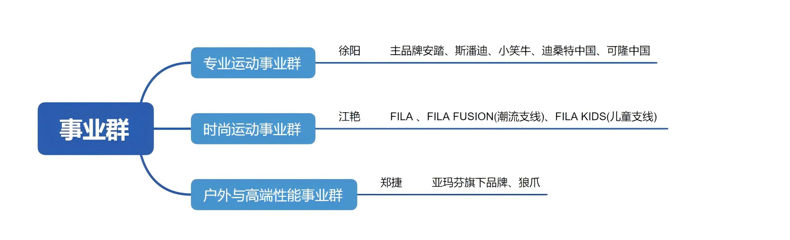 針對旗下各品牌,安踏按照品牌調性,專門劃分并設置了專業(yè)運動、時尚運動、戶外與高端性能三大品牌事業(yè)群,分別由徐陽、江艷、鄭捷擔任CEO,各事業(yè)群獨立運營。