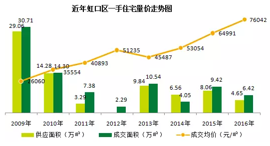 從近年虹口區(qū)一手住宅供求價(jià)走勢可以明顯看出,虹口區(qū)基本處于供不應(yīng)求的狀態(tài),自2011年上海限購以來,供求量均出現(xiàn)大幅下滑,但成交價(jià)格卻呈明顯上揚(yáng)趨勢。據(jù)上海鏈家市場研究部數(shù)據(jù)顯示:截至目前,2016年虹口區(qū)一手住宅供應(yīng)量僅為4.65萬方,成交量為6.42萬方,成交均價(jià)卻已高達(dá)76042元/㎡,較去年上漲17%,而與2009年相比,8年不到房價(jià)翻了近3倍。