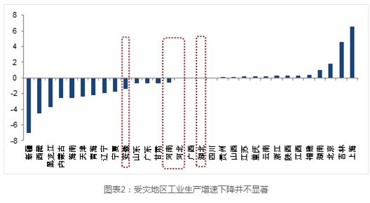 第二理由是部分地區(qū)洪澇災害對工業(yè)生產產生了一定影響。然而,根據(jù)分析受災省份工業(yè)生產后發(fā)現(xiàn),各省的受災情況和工業(yè)生產減速情況并不完全匹配。例如,根據(jù)民政部發(fā)布的7月災情分析報告,河北,湖北,安徽,河南受災情況較重,而這四個省的工業(yè)增加至都只有輕微的減速,分別為5.1%、8.3%、7.7%、7.6%,比6月回落了0.1、0、1.4和0.6個百分點。湖南,貴州,江西,吉林,北京,四川等受災區(qū),7月工業(yè)增加值增速甚至高于6月增速。而減速幅度最大的幾個省卻并非受災區(qū),如新疆、西藏、海南分別7月工業(yè)增加值分別下降7、4.5、2.6個百分點,無法用洪澇災害的負面影響解釋。